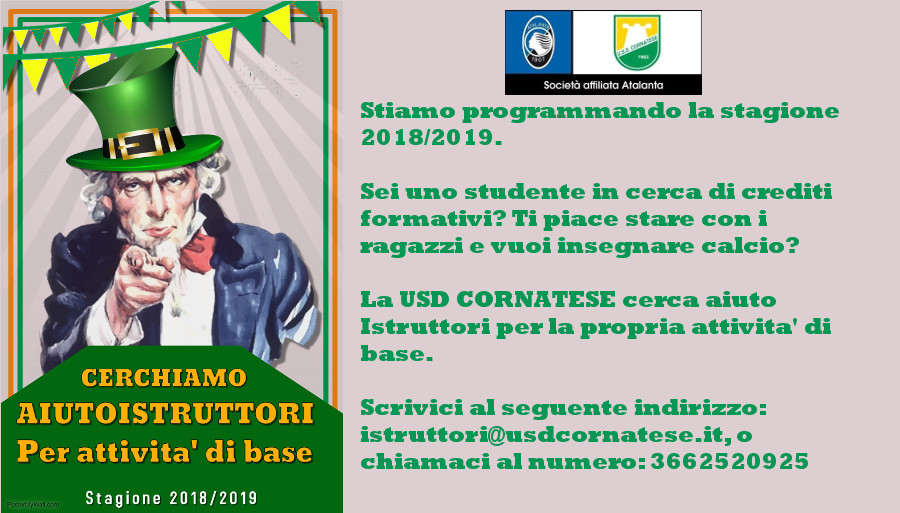La USD CORNATESE cerca aiuto Istruttori per la propria attivita’ di base. Scrivici al seguente indirizzo: istruttori@usdcornatese.it, o chiamaci al numero 3662520925.
