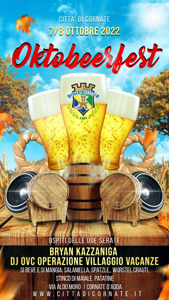 Accorrete numerosi all’oktobeer fest, venerdi 7 e sabato 8 ottobre. A partire dalle 19:30 nella tensostruttura del Centro sportivo di Cornate d’Adda, in Via Aldo Moro 1. Birra a volonta’, salamelle, spatzle,, Wurstel crauti, stinco di maiale patatine .