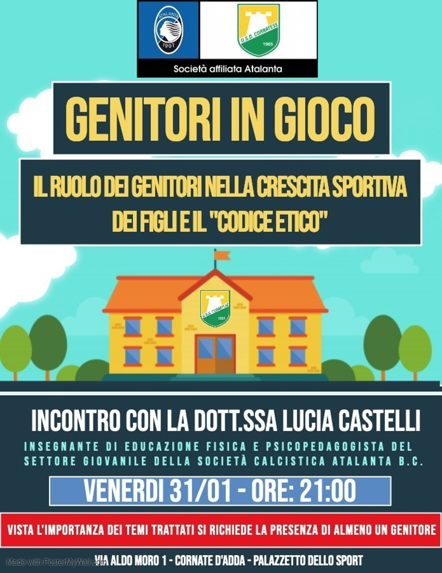 Venerdi 31/01, alle ore 21:00, incontro con la Dott.essa Lucia Castelli, insegnante di educazione fisica e psicopedagogista del settore giovanile di Atalanta BC. Non mancate.